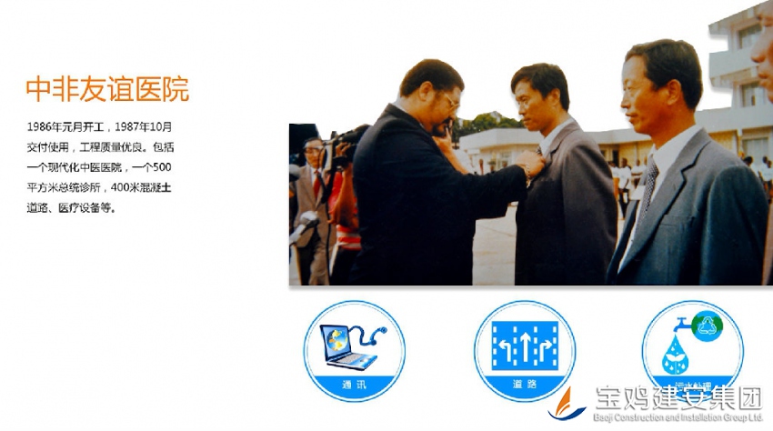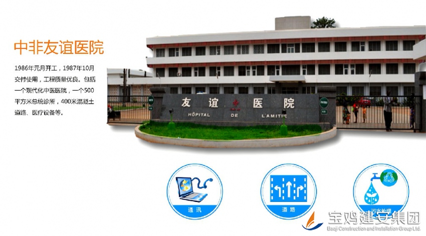 Constructed by Construction & Installation Group, China-Africa Friendship Hospital with gross building area of 14000m2 was started on January, 1986 with attendance of 110 employees of the company and was delivered on October, 1987, possessing high project quality.